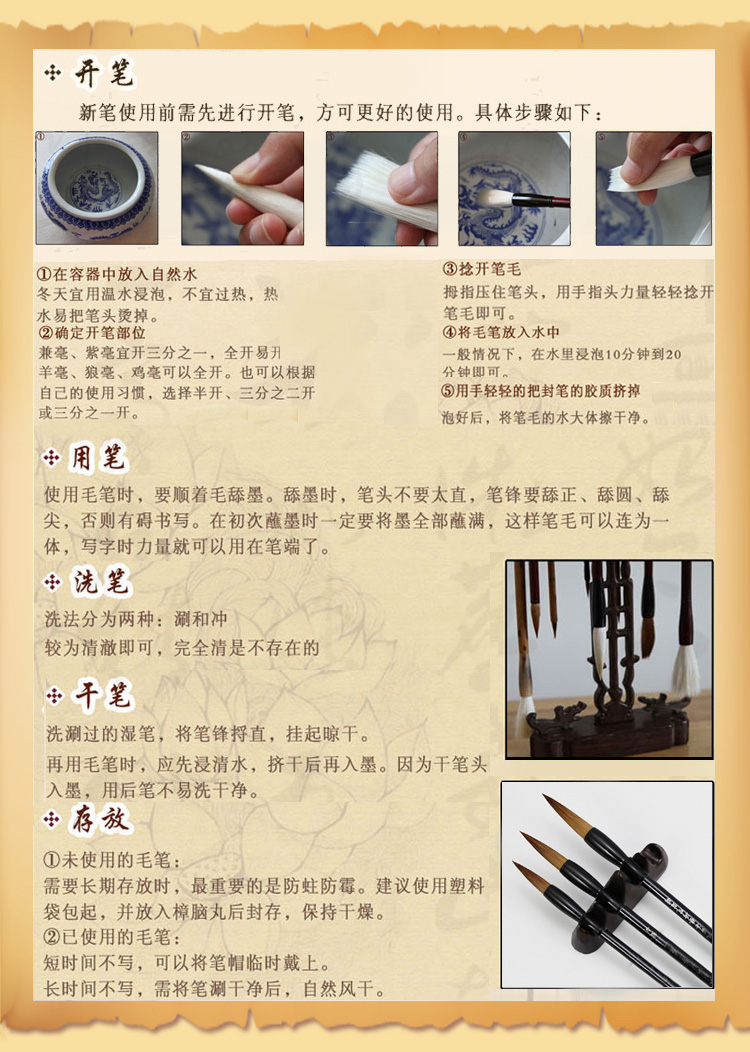 笔杆选用天然竹杆,因为季节选材不同原因,以出厂时的笔杆为准此外笔头均为手工制作,笔头误差在两毫米以内属于正常误差