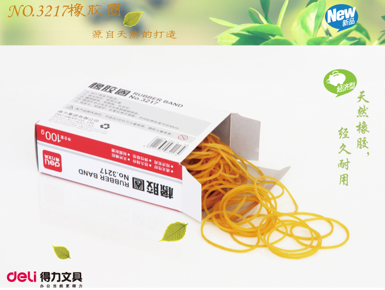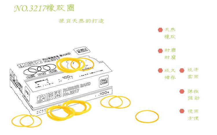 NO3217橡胶圈,产品净含量是100克每盒,天然橡胶合成,韧度好,经济实用,经久耐磨,可用于各种办公及 生活各种用途。