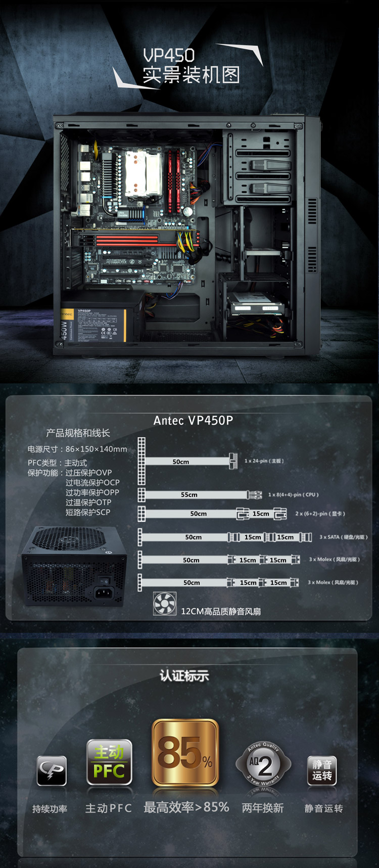 额定450W VP 450P 电源(主动式PFC/12CM静音风扇/电脑电源/双显卡接头/台式机电源)
