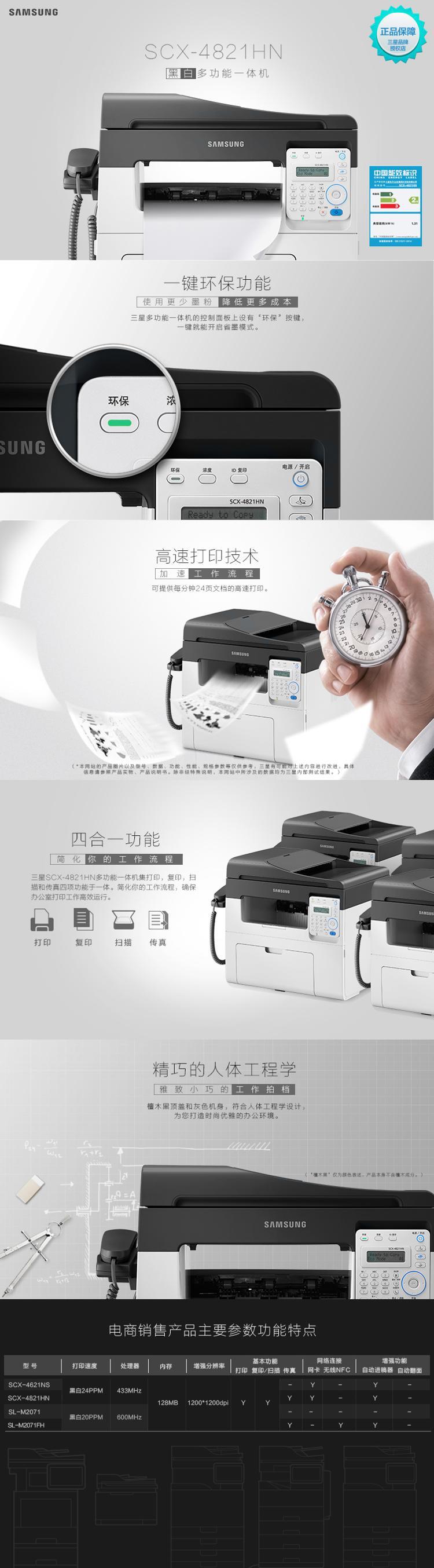 三星(SAMSUNG)SCX-4821HN 激光 黑白打印机 打印/复印/扫描/传真 支持有线网络 打印速度快 成像质量高 噪音低